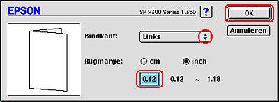 De werkelijke rugmarge kan afwijken van de opgegeven instellingen. Dit hangt af van de toepassing waarmee u werkt. Probeer daarom eerst een paar vellen uit om te zien wat het resultaat zal zijn, voordat u de volledige afdruktaak afdrukt.
