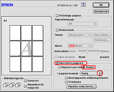 Schakel in het dialoogvenster voor de lay-out het selectievakje Meerdere pagina's in en selecteer Poster.