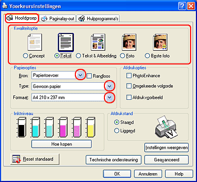 Klik op het tabblad Hoofdgroep en geef de gewenste instelling op bij Kwaliteitoptie. Raadpleeg het hierna genoemde gedeelte voor meer informatie over de instellingen voor Kwaliteitoptie. Zie Kwaliteitoptie