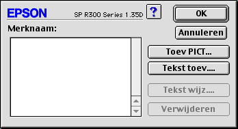 ![]() | Om een beeldbestand als watermerk te gebruiken, klikt u op Toev PICT. Geef het gewenste beeldbestand op en klik op Open. |