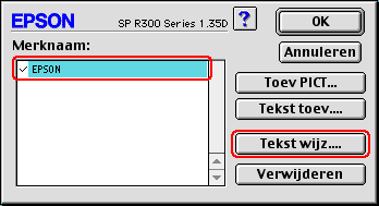 ![]() | De naam van het beeldbestand of de tekst van het watermerk verschijnt in de lijst Merknaam van het dialoogvenster Watermerk. Om de naam van een op beeld gebaseerd watermerk te wijzigen, selecteert u de naam in de lijst en typt u vervolgens een nieuwe naam. Wanneer een op tekst gebaseerd watermerk is geselecteerd in de lijst Naam, kunt u de tekst, het lettertype en de tekenstijl wijzigen door op Tekst wijz. te klikken. |