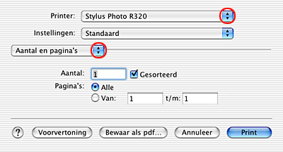 De instellingen voor Aantal en pagina's zijn de standaardinstellingen van Mac OS X. Raadpleeg de documentatie bij uw besturingssysteem voor meer informatie.