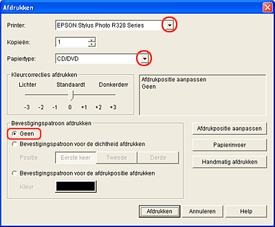 Zorg ervoor dat EPSON Stylus Photo R320 Series is geselecteerd als printernaam.