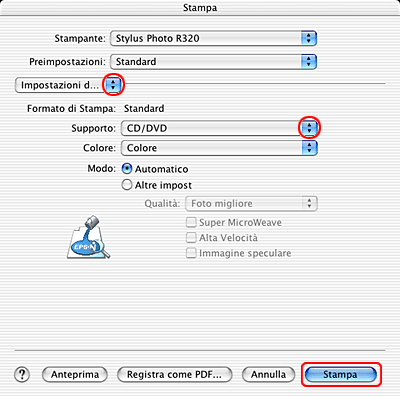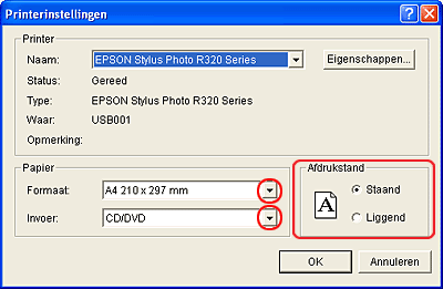 Zorg ervoor dat EPSON Stylus Photo R320 Series is geselecteerd als printer.