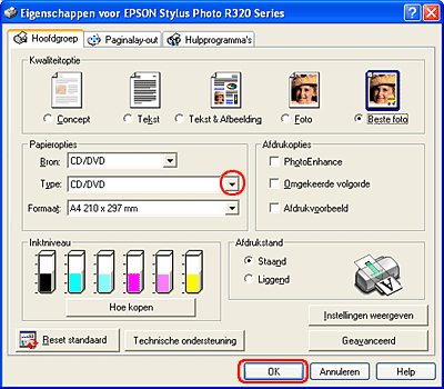 Zorg ervoor dat Stylus Photo R320 is geselecteerd als printer.