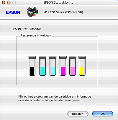 U kunt dit programma ook gebruiken om vóór het afdrukken het inktniveau te controleren. EPSON StatusMonitor toont hoeveel inkt er nog was op het moment dat u het programma opende. Als u de informatie over de hoeveelheid resterende inkt wilt actualiseren, klikt u op Updaten.