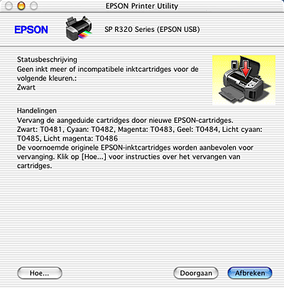 Als de inkt (bijna) op is, verschijnt onder het tekstvak een knop Hoe. Als u op Hoe klikt, wordt u door EPSON Status Monitor 3 stap-voor-stap begeleid bij de procedure voor het vervangen van de cartridge.