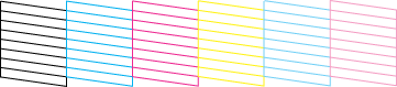 Als de kwaliteit niet goed is (zie illustratie), is er iets mis met de printer. Als er bijvoorbeeld stukken uit de afgedrukte lijnen ontbreken, is er wellicht sprake van een verstopt spuitkanaaltje of een onjuist uitgelijnde printkop.