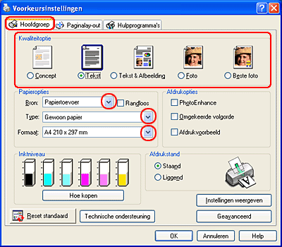 Klik op het tabblad Hoofdgroep en geef de gewenste instelling op bij Kwaliteitoptie. Zie de online-Help voor meer informatie.