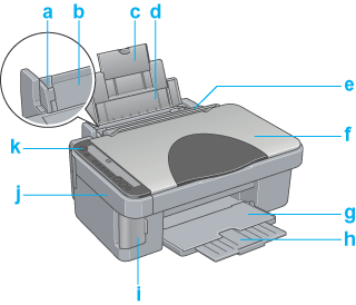 e. Beschermkap papiertoevoer: voorkomt dat voorwerpen die u op het deksel hebt geplaatst in het apparaat vallen wanneer u het deksel opent.