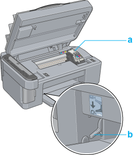 b. Instelhendel: bepaalt de afstand tussen de printkop en het papier. Zo kunnen vegen op het papier worden voorkomen. Zet de instelhendel op