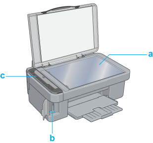 c. Verlengstuk van papiersteun: dient als steun voor grotere papierformaten in de papiertoevoer.