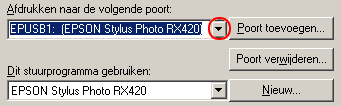 Als EPUSBx: (EPSON Stylus Photo RX420) wordt weergegeven in de keuzelijst Afdrukken naar de volgende poort (Print to the following port), zijn de printerdriver voor de USB-printer en de printersoftware goed geïnstalleerd. Als de juiste poort niet is geïnstalleerd, gaat u door met de volgende stap.