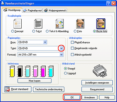 Kies CD/DVD of CD/DVD Premium Surface als instelling bij Type.