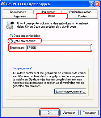 U moet de printer eerst instellen als gedeelde printer via de computer waarop de printer rechtstreeks is aangesloten. Vervolgens moet u de printer toevoegen aan elke computer die via het netwerk gebruik gaat maken van de printer.