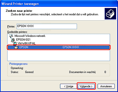 selecteer Netwerkprinter, of een printer die met een andere computer is verbonden en klik op Volgende.
