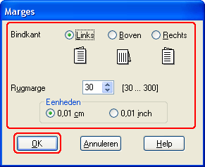 Geef de rand aan waar het papier wordt gebonden. U kunt kiezen uit Links, Boven en Rechts.