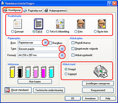 Klik op het tabblad Hoofdgroep en selecteer een van de volgende instellingen bij Kwaliteitoptie: