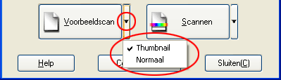 Wanneer u op Voorbeeldscan klikt, wordt de voorbeeldscan gemaakt en weergegeven in het daarvoor bestemde venster. Afhankelijk van de gekozen modus en de instellingen bij Documenttype staat er een klein pijltje rechts naast de knop Voorbeeldscan. Via dat pijltje bepaalt u op welke manier de voorbeeldscans moeten worden gemaakt. Klik op de pijl en selecteer Miniatuur of Normaal.