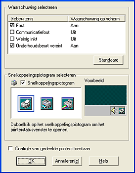 Klik op deze knop om het dialoogvenster Controlevoorkeursinstellingen te openen, waarin u instellingen kunt vastleggen voor EPSON Status Monitor 3.