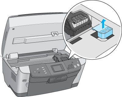 ![]() | Open de scannereenheid en controleer of de printkop zich in de uitgangspositie (rechts) bevindt. Haal het beschermende materiaal uit de speciale opbergplek. |