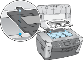 Bevestig de filmhouder in de daarvoor bestemde opening op het apparaat en zorg er daarbij voor dat het filmstrookgedeelte in het midden van de glasplaat ligt.