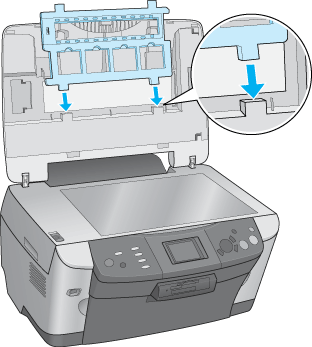 Wanneer u de filmhouder niet gebruikt, kunt u deze bewaren in het deksel. Zie De filmhouder opbergen voor meer informatie.