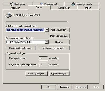 Als EPUSBx: (EPSON Stylus Photo RX600) wordt weergegeven in de keuzelijst Afdrukken naar de volgende poort (Print to the following port), dan zijn de printerdriver voor de USB-printer en de printersoftware goed geïnstalleerd. Als de juiste poort niet is geïnstalleerd, gaat u door met de volgende stap.