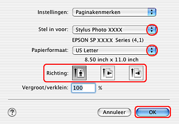 ![]() | Geef de gewenste instellingen op bij Papierformaat en Richting. |
