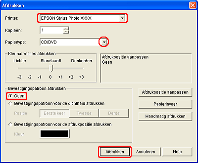Als de afdrukpositie niet helemaal goed is, kunt u dit aanpassen met EPSON Print CD. Zie de Help van EPSON Print CD voor meer informatie.