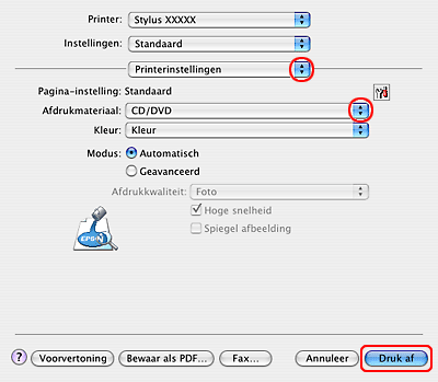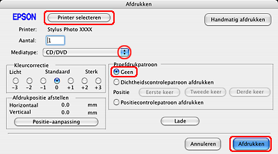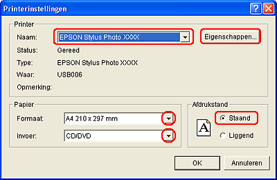 Wanneer u op een cd/dvd wilt afdrukken met een in de handel verkrijgbaar softwarepakket dat hiervoor geschikt, moet u de volgende instellingen opgeven.