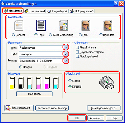 Selecteer Enveloppe bij Medietype en selecteer de gewenste instellingen bij Kleur en Modus. Zie de online-Help voor meer informatie over Printerinstellingen.