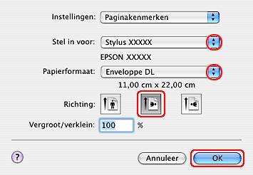Selecteer het gewenste envelopformaat bij Papierformaat. U kunt ook een aangepast envelopformaat definiëren. Zie de online-Help voor meer informatie.