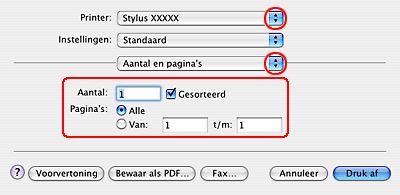 Selecteer de printer die u gebruikt bij Printer en geef de gewenste instellingen op in Aantal en pagina's.