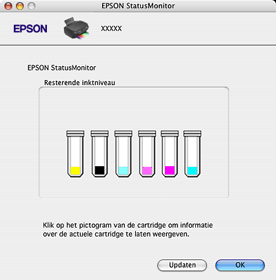 ![]() U kunt dit programma ook gebruiken om vóór het afdrukken de cartridgestatus te controleren. EPSON StatusMonitor toont de cartridgestatus van het moment waarop het programma werd geopend. Klik op Updaten als u de cartridgestatus wilt actualiseren.