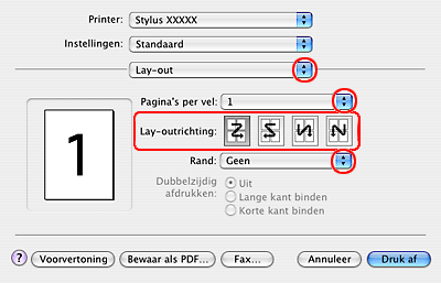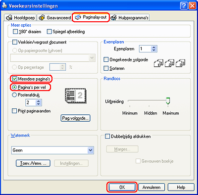 Hiermee worden meerdere pagina's van uw document afgedrukt op één vel papier. U kunt kiezen uit 1, 2, 4, 6, 9 en 16.