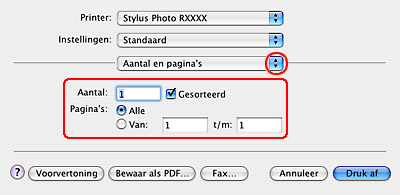 Selecteer de printer die u gebruikt bij Printer. Geef vervolgens de gewenste instellingen op in Aantal en pagina's.