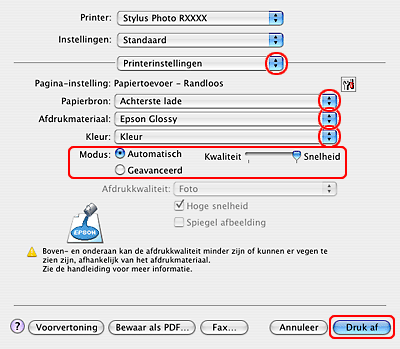 Selecteer XXX (Papiertoevoer - Randloos) als u randloze foto's wilt afdrukken.