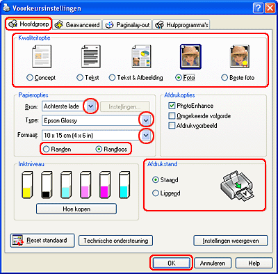 Volg de onderstaande instructies om de juiste printerinstellingen op te geven.