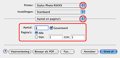 Selecteer de printer die u gebruikt bij Printer. Geef vervolgens de gewenste instellingen op in Aantal en pagina's.