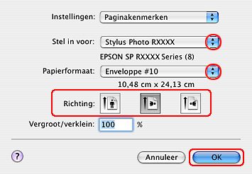 Selecteer het gewenste envelopformaat bij Papierformaat. U kunt ook een aangepast envelopformaat definiëren. Zie de online-Help voor meer informatie.