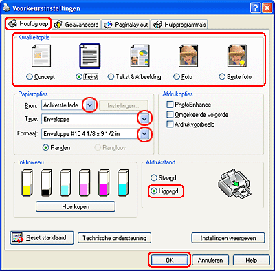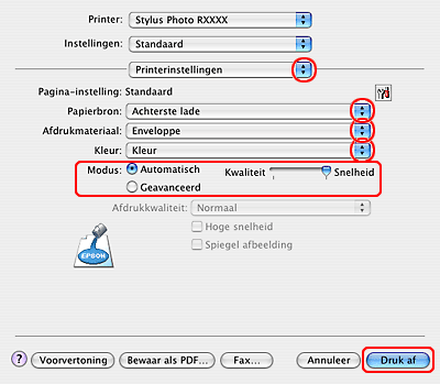 Selecteer Enveloppe bij Medietype en selecteer de gewenste instellingen bij Kleur en Modus. Zie de online-Help voor meer informatie over Printerinstellingen.