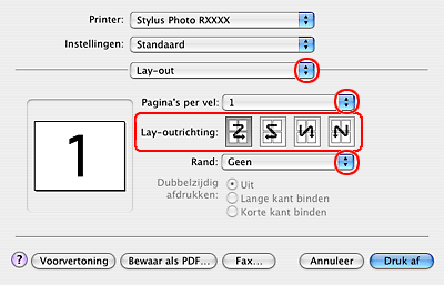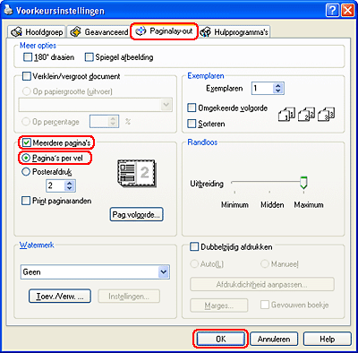 Hiermee worden meerdere pagina's van uw document afgedrukt op één vel papier. U kunt kiezen uit 1, 2, 4, 6, 9 en 16.