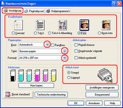 Klik op het tabblad Hoofdgroep en selecteer een van de hieronder aanbevolen instellingen bij Kwaliteitoptie. Zie de online-Help voor meer informatie over de andere instellingen onder Kwaliteitoptie.