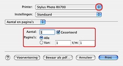 De instellingen voor Aantal en pagina's zijn de standaardinstellingen van Mac OS X. Raadpleeg de documentatie bij uw besturingssysteem voor meer informatie.