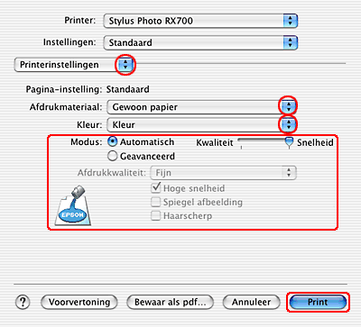 Geef de gewenste instelling op bij Afdrukmateriaal, Kleur en Modus. Zie de online-Help voor meer informatie over de Printerinstellingen.