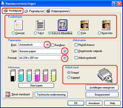 Klik op het tabblad Hoofdgroep en selecteer een van de hieronder aanbevolen instellingen bij Kwaliteitoptie. Zie de online-Help voor meer informatie over de andere instellingen onder Kwaliteitoptie.