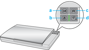 E-mail (knop)b. PDF (knop)c. Kopiëren (knop)d. Aan/uit/ Start (knop)U kunt Epson Scan starten door eenvoudigweg op de Startknop