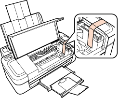 Open het printerdeksel. Maak de cartridgehouder vast met tape, zoals hieronder wordt weergegeven, en sluit vervolgens het printerdeksel.