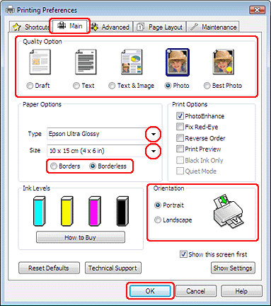 Merk av for Borderless (Uten kant) hvis du vil skrive ut fotografier uten kanter.